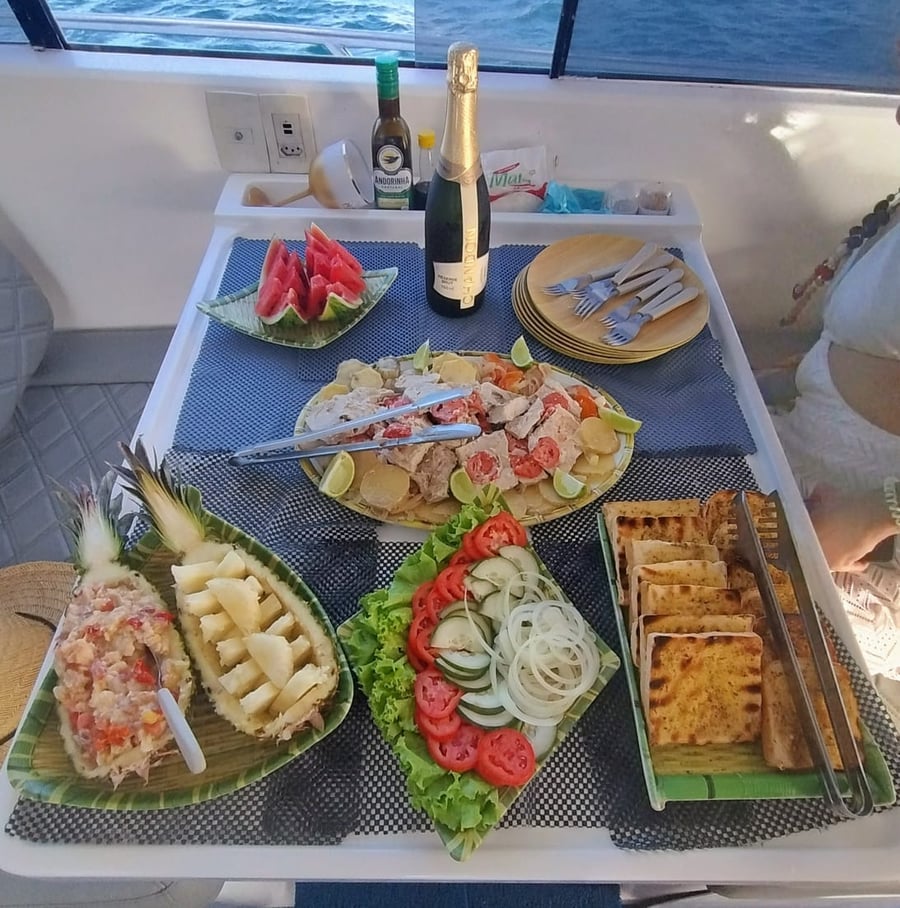 INCLUI: Som bluetooth; Churrasco de peixe; Cooler para bebidas; Equipamento de flutuação; Plana Sub