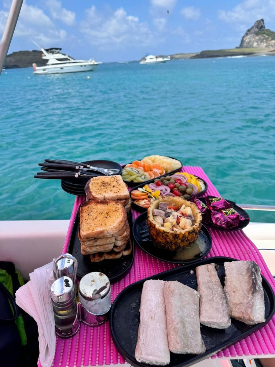 Desfrute de um mágico passeio de barco ao entardecer em Fernando de Noronha, com churrasco de peixe a bordo e um pôr do sol inesquecível na Praia da Conceição!